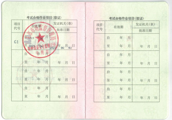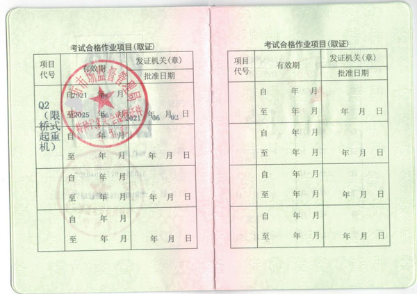 叉車司機-叉車證N1,電梯維修T,特種安全設備管理A,起重機指揮Q1,Q2起重司機(限門座式起重機),Q2起重司機(限橋式起重機),Q2起重司機(限門式起重機),Q2起重司機(限纜索式起重機),Q2起重司機(限塔式起重機)Q2起重司機(限流動式起重機)Q2起重司機(限升降機),觀光和觀光列出司N2,壓力容器壓力管道管理A,電梯管理A,起重機械管理A,場(廠)內專用機動車輛管理A,工業鍋爐司爐G1,電站鍋爐司爐G2,鍋爐水處理G3,快開門式壓力容器操作R1,移動式壓力容器充裝R2,氣瓶充裝P,金屬焊接操作-壓力焊PE焊,非金屬焊接操作-壓力容器焊,食品檢驗員,化學檢驗員,農產品檢驗員(4年一審,需要到期前3個月進行)從事特殊工種作業人員必須熟悉相應特殊工種作業的安全知識及防范各種意外事故的技能。要求從業人員持卡上崗,即由國家安全生產監督管理局頒發《中華人民共和國特種作業操作證》方可上崗。