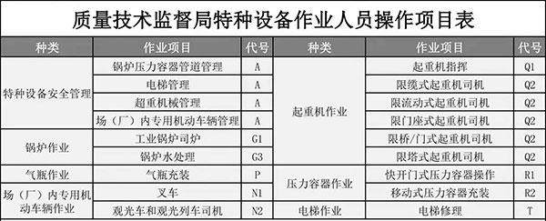 質監局:報考工種:特種安全設備管理A,起重機指揮Q1,起重司機(限門座式起重機)Q2,起重司機(限橋式起重機)Q2,起重司機(限門式起重機)Q2,起重司機(限纜索式起重機)Q2,起重司機(限塔式起重機)Q2,起重司機(限流動式起重機)Q2,起重司機(限升降機)Q2,叉車司機N1,觀光和觀光列出司機N2,電梯維修T,鍋爐壓力容器壓力管道管理,電梯管理,起重機械管理,場(廠)內專用機動車輛管理,工業鍋爐司爐,電站鍋爐司爐,鍋爐水處理,快開門式壓力容器操作,移動式壓力容器充裝,氣瓶充裝,金屬焊接操作(壓力焊PE焊),非金屬焊接操作(壓力容器焊),食品檢驗員,化學檢驗員,農產品檢驗員!