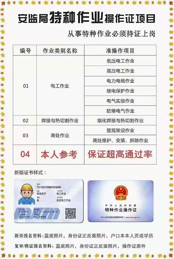 低壓電工操作證,高壓電工操作證,熔化焊接與熱切割作業,焊工操作證,電力電纜,繼電保護,電氣試驗,防爆電氣作業,高處安裝維護拆除作業,登高架設作業,制冷與空凋設備運行操作作業,制冷與空凋設備安裝修理作業,施工吊裝作業,施工挖裝作業,危化品負責人/管理人員,危化品從業人員上崗證。