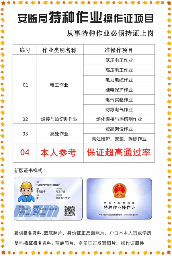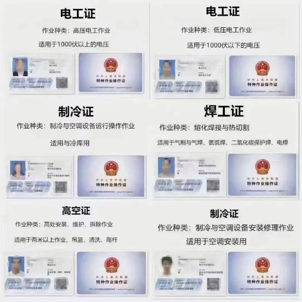 電工證-低壓-高壓,熔化焊接與熱切割作業-焊工證,電力電纜,繼電保護,電氣試驗,防爆電氣作業,高處安裝維護拆除作業,登高架設作業,制冷與空凋設備運行操作作業,制冷與空凋設備安裝修理作業,施工吊裝作業,施工挖裝作業,危化品負責人/管理人員,危化品從業人員上崗證,特種作業人員必須經專門的安全技術培訓并考核合格,取得《中華人民共和國特種作業操作證》(以下簡稱特種作業操作證)后,方可上崗作業。