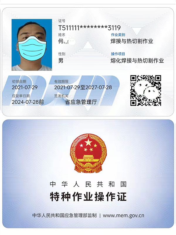 焊工操作證也稱為焊工上崗證,是由各省應(yīng)急管理局,頒發(fā)的,像身份證一樣大小,是IC卡形式的。焊工操作證是焊工作業(yè)必須持有的證件,具有極強的法律效應(yīng),也就是說,如果焊工在某個單位任職,如果遇到相關(guān)部門進行安全檢查,一旦查出沒有焊工操作證卻從事相關(guān)工作,不僅會被開除,還要追究單位的責(zé)任,尤其是當(dāng)發(fā)生安全事故時,沒有證書就會處于劣勢。