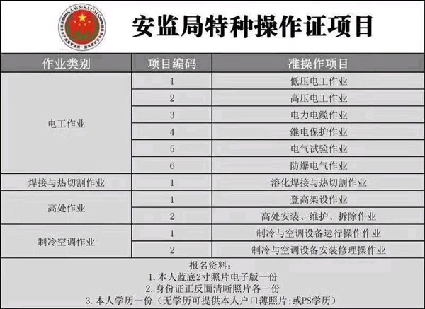 電工證-低壓,電工證-高壓,熔化焊接與熱切割作業,電力電纜,繼電保護,電氣試驗,防爆電氣作業,高處安裝維護拆除作業,登高架設作業,制冷與空凋設備運行操作作業,制冷與空凋設備安裝修理作業;